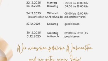Bitte beachten Sie unsere veränderten Öffnungszeiten rund um Weihnachten und Silvester