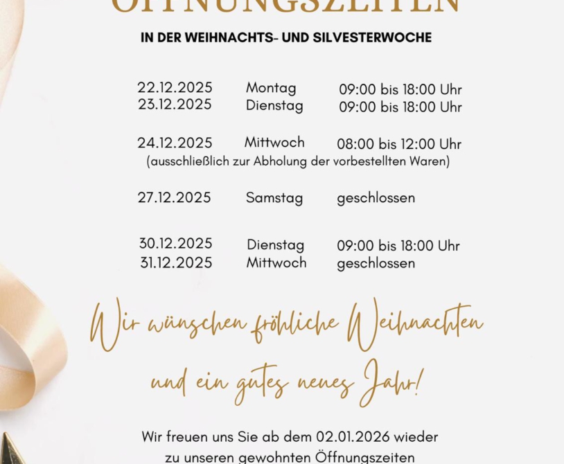Bitte beachten Sie unsere veränderten Öffnungszeiten rund um Weihnachten und Silvester